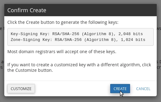 - Nachdem Sie dies getan haben, klicken Sie erneut auf die Schaltfläche Erstellen. Wenn wir benutzerdefinierte Einstellungen benötigen, können wir auf die Schaltfläche Anpassen klicken. Die Standardeinstellungen funktionieren mit den meisten Registraren.