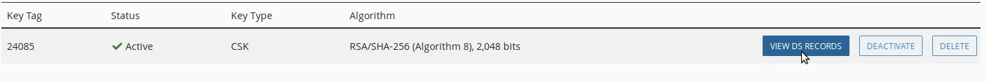 - Im nächsten Fenster finden wir die benötigten Schlüssel zur Konfiguration von DNSSEC im Registrar-Panel.