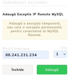 • Im Moment ist die Funktion zum Hinzufügen von IPs in MySQL-Remote nur für Shared-Pakete erlaubt. Wenn Sie es also auf einem VPS hinzufügen möchten, müssen Sie die technische Abteilung von Hostico kontaktieren.