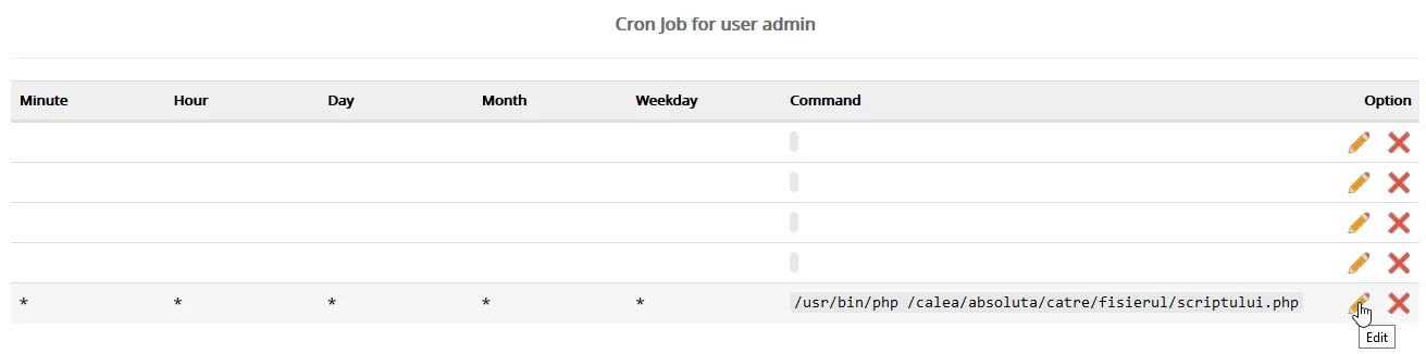 - Anschließend kann der Cron-Job am Ende der Seite im Abschnitt Cron-Job für Benutzer admin angezeigt oder bearbeitet werden.