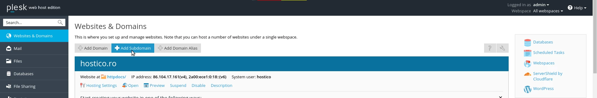 Hinzufügen eines Subdomains im Plesk-Administrationspanel.