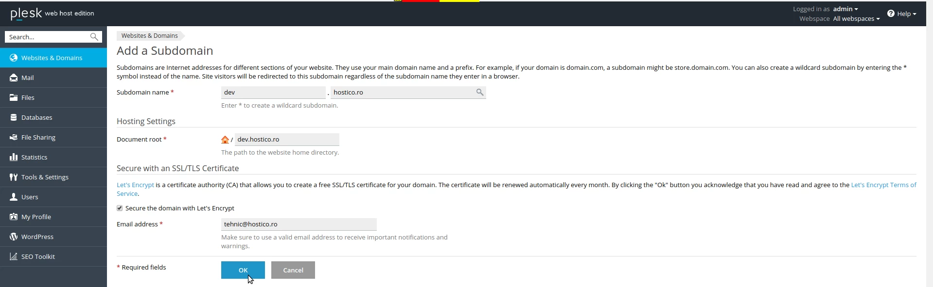 - Hier können wir den Pfad für Dateien festlegen, Document root und das Subdomain durch Let's Encrypt absichern.