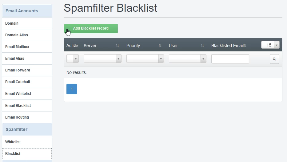 - Das Blacklist-Menü im Spamfilter-Bereich von ISPConfig ermöglicht es uns, jede Nachricht, die von einem E-Mail-Postfach empfangen wird, als Spam zu kennzeichnen, unabhängig davon, ob sie tatsächlich Spam ist oder nicht.