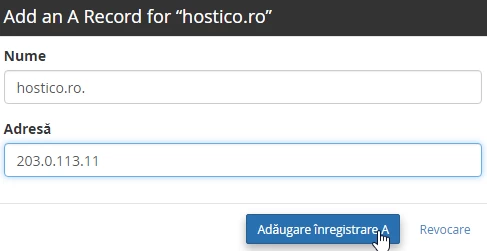 - Im Name-Feld fügen wir den Domainnamen hinzu, für den wir den A-Eintrag hinzufügen (hostico.ro), und im Address-Feld fügen wir die IP-Adresse IP (IPv4) des Servers hinzu, der die Domain hostet 203.0.113.11.
