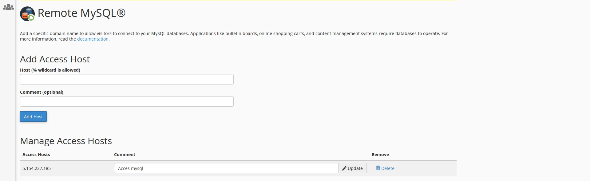 - In diesem Tutorial zeigen wir Ihnen, wie Sie den Remote MySQL® Zugriff im cPanel-Konto konfigurieren. Der Remote MySQL® Zugriff ist standardmäßig nicht aktiviert, und Sie müssen uns eine E-Mail an help@hostico.com senden, um ihn aktivieren zu lassen, unter Angabe einer IP-Adresse, von der aus die Verbindung hergestellt wird.