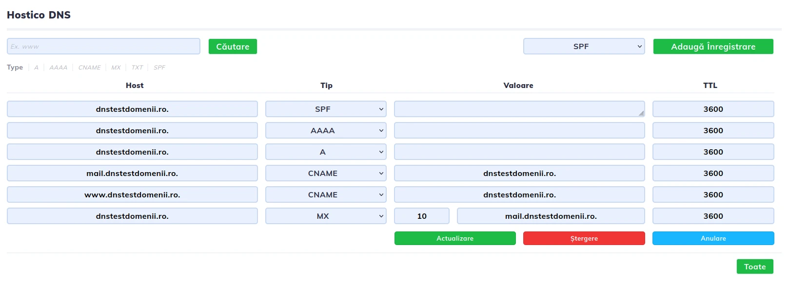 In der neuen offenen Schnittstelle werden die aktiven DNS-Einträge für die ausgewählte Domain angezeigt.