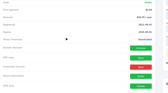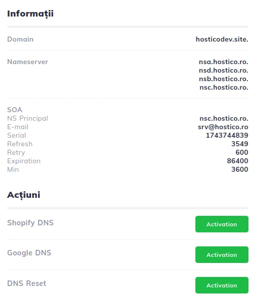 Auf der rechten Seite des Bildschirms befindet sich ein Fenster, das der Anzeige allgemeiner Informationen zu den aktiven DNS-Einstellungen für die Domain gewidmet ist. Sollten Sie die DNS-Zone an eine externe Plattform wie Shopify oder Google umleiten wollen, kann dies einfach über das Aktionsmenü in der Benutzeroberfläche erfolgen.