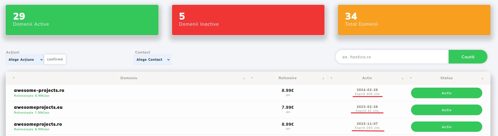 - Hier können Sie die Domains einsehen, die Sie besitzen, sowie Informationen darüber, wie: Registrierungsdatum, Ablaufdatum, Domainstatus;